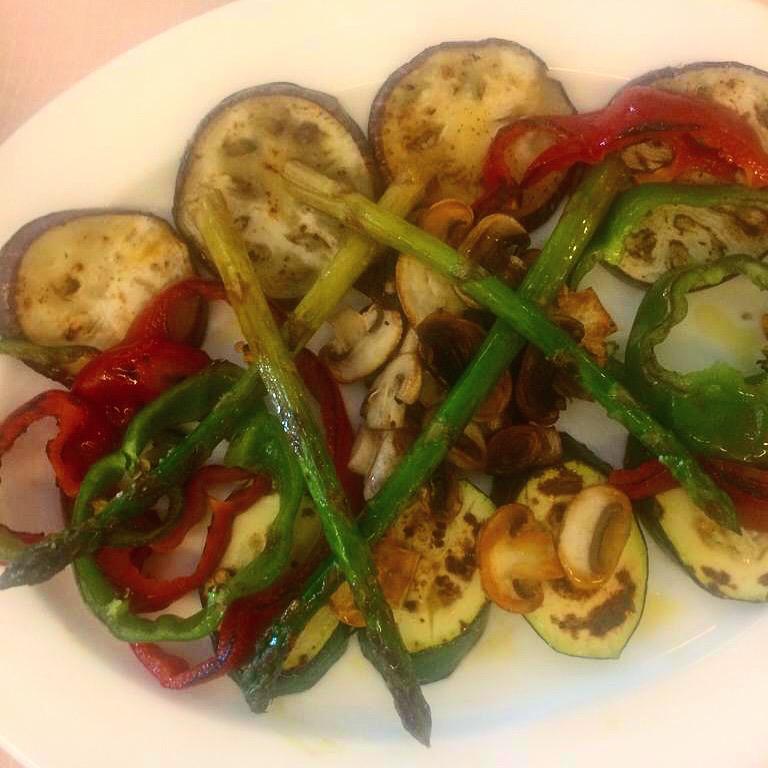 En el medio colocamos una ensalada de queso, yogur y frutos secos, además de una rica parrillada de verduras compuesta por espárragos, berenjenas, champiñones y pimientos. No pudo faltar el pan tostado con tomate y allioli, de elaboración casera.