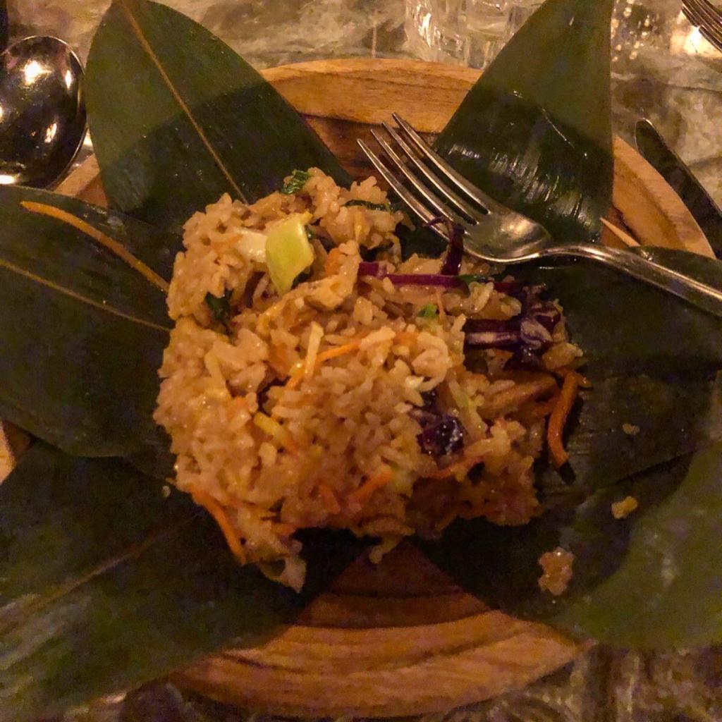 Después de Rituals, Voltereta nos sentó a la mesa y nos volvió a tapar los ojos. Jugamos a un juego: una cata a ciegas (¡me encantan!). La cena comenzó con flor de nasi goreng, plato donde teníamos que adivinar los ingredientes y es que esta mezcla de arroz frito con salsa balinesa, verduritas y pollo es súper sabrosa y sencilla de identificar, puesto que los sabores están juntos pero no se mezclan de manera desagradable ni homogénea, sino que armonizan a la perfección.