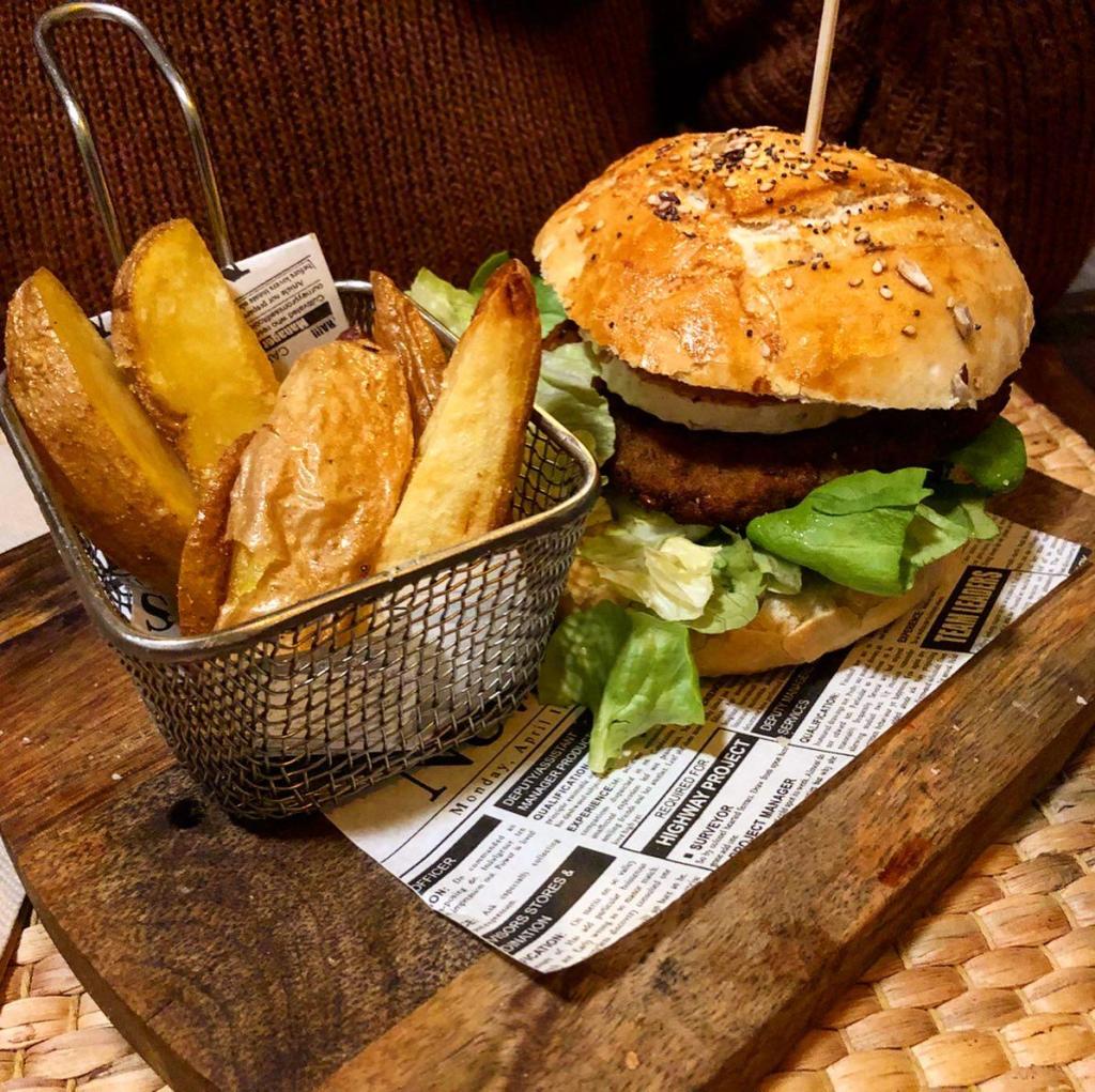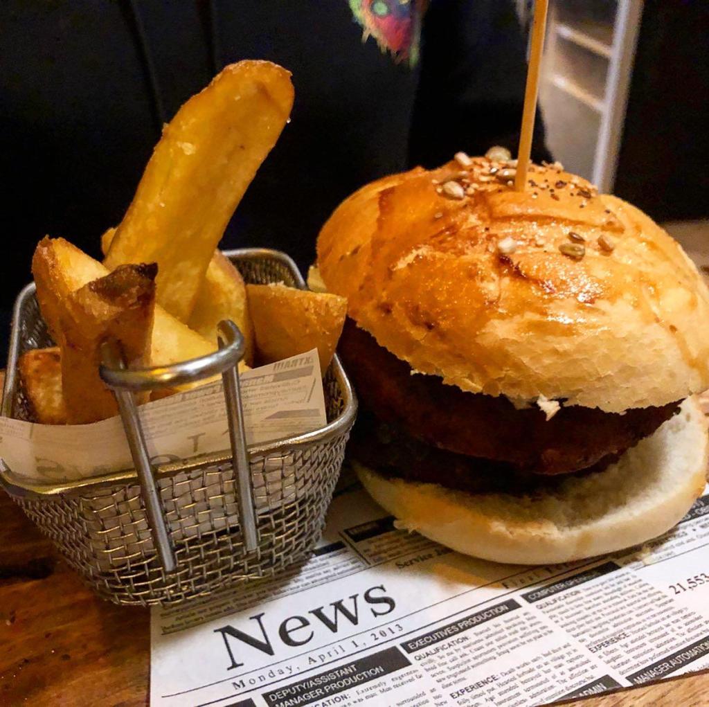 Mi amiga, piscívora también y amante a su vez, como yo, del falafel, personalizó la opción ‘Argentina’, que es una hamburguesa con doble de ternera, cambiando el doble de ternera por doble de falafel. Sabia elección. Lleva también cebolla caramelizada, queso Brie y salsa Chimichurri.
