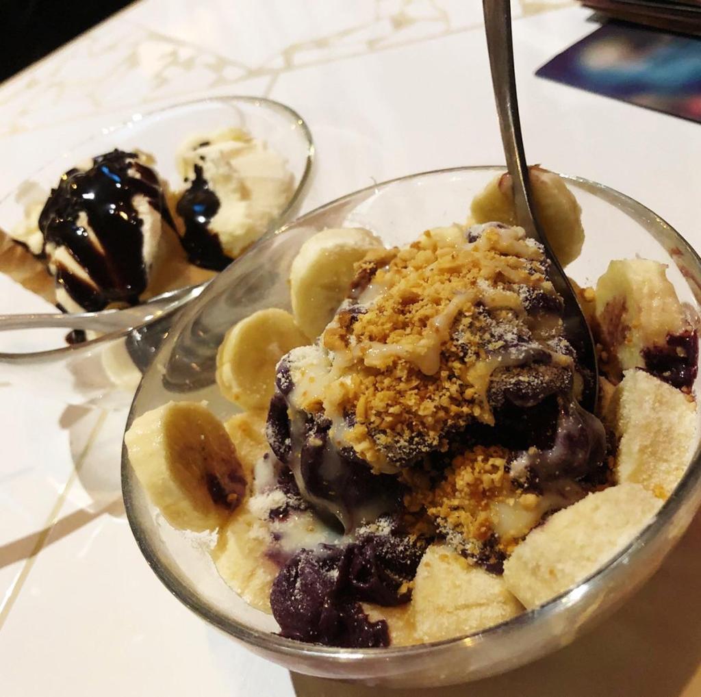 De postre pedimos un bowl de helado de vainilla con su buen chorretón de chocolate por encima y un açaí adornado con plátano, cacahuetes en polvo, guaraní, leche condensada y leche en polvo.