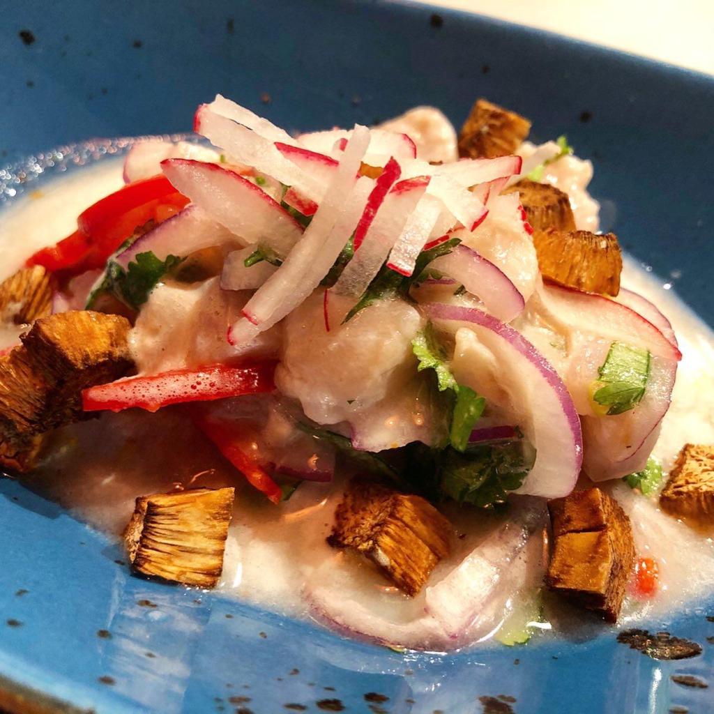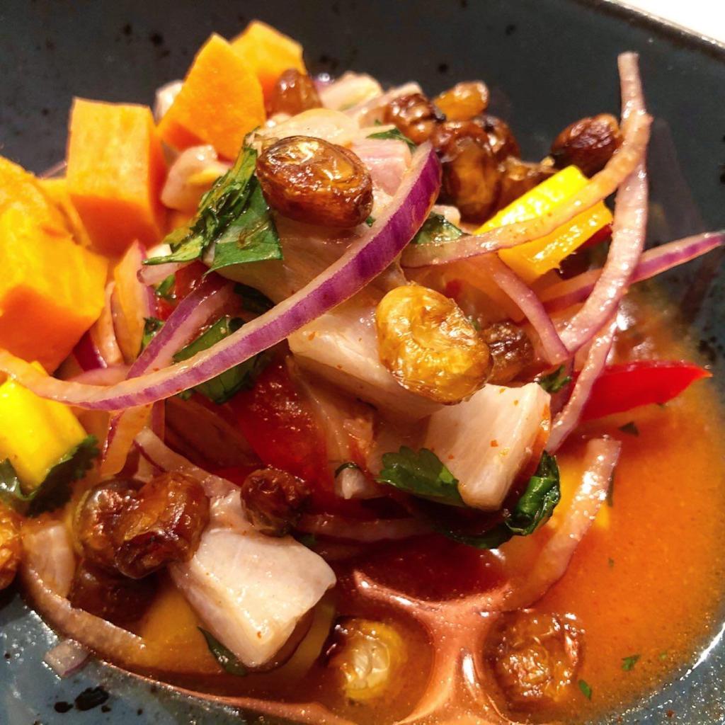 Disfrutamos de un delicioso Kurripaco, un ceviche de corvina, boniato, mango y choclo horneado. Este último ingrediente es una variedad de maíz de gran tamaño, de sabor parecido al quico.