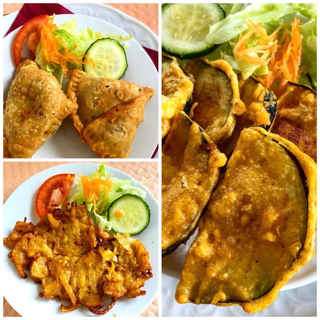 De principales pedimos samosas, vienen dos por ración, onion Bhaji, que en el menú quedaba descrita como “empanadilla de cebolla”, pero nada más lejos… era simple y llanamente cebolla frita. Junto a estos dos, Baingan Pakora, un delicioso plato que consistía en berenjena rebozada con harina de garbanzos, su sabor recordaba al falafel.