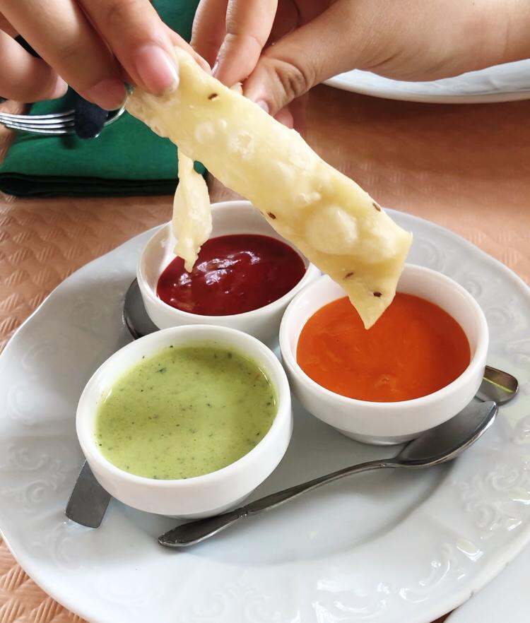 Para picar tuvieron el detalle de sacarnos tres salsas diferentes: una verde de yogur y menta (la que menos nos convenció); una roja que llevaba tomate y chili molido, cuyo toque picante despertó nuestro interés y un poco más a nuestros estómagos y la naranja, hecha con mango. Esta última fue la ganadora de la ronda.