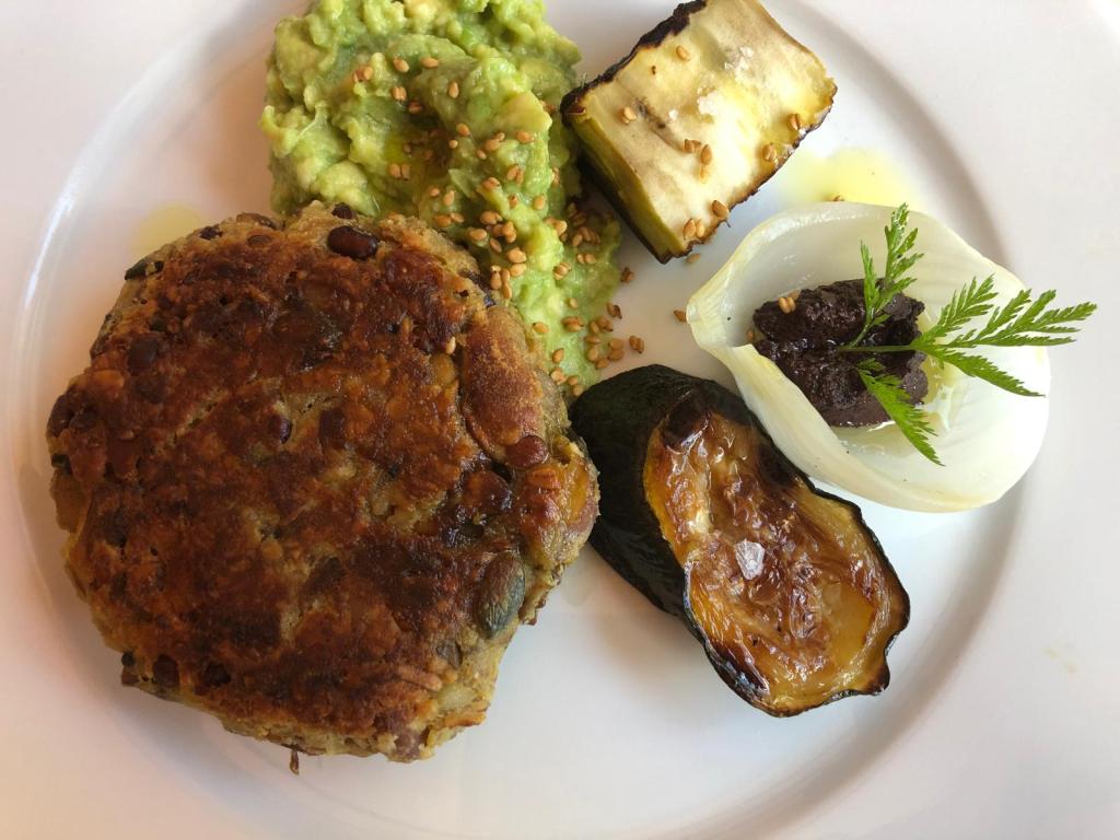 De segundo, hamburguesa de legumbres, acompañada de hortalizas. Han dado en el clavo con la densidad apropiada para este tipo de hamburguesas. Hay mucha gente que todavía teme los menús vegetarianos o veganos, pero creo con firmeza que es una opción apta para todo tipo de comensales con la mente abierta, que las frutas y verduras que conforman estas apetitosas recetas son toda una bendición al paladar. No hay que limitar miras, ni imaginarse una ensalada insulsa, las dietas no-cárnicas pueden llegar a ser muy dinámicas y divertidas. De hecho, lo son.