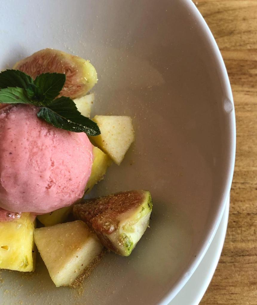 Por último, helado de fresa, en un nido de piña, manzana e higos. Era el postre ideal para aquellaa comida: ligero y refrescante para un día de principios de junio, donde el calor, poco a poco pero con ímpetu va in crescendo.