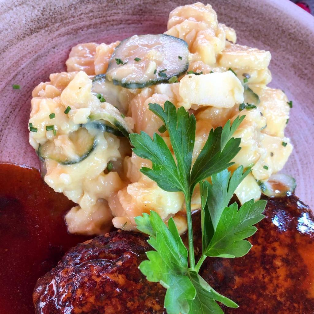 Por otro lado, el carnívoro del día es conocido como ‘Biergartenplatte’, es decir, plato de jardín de cerveza y está compuesto por escalope de Múnich al estilo vienés, empanadas de ternera, con ensalada de patata y pepino. Es cierto que, desde mi perspectiva, la carne no era demasiado prometedora, pero la ensalada llamó realmente mi atención y por eso la encontré poderosamente apetitosa.