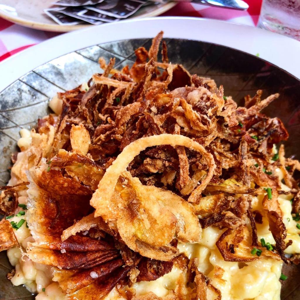 Sobre los dos platos que hoy os traigo, el primero es el famoso Spaetzle de queso Allgäu, con queso de montaña picante de Zillertal, cebollas asadas, servido en tortitas y una pequeña ensalada. He de decir que este es un plato muuuy fuerte, para que os hagáis una idea, nuestro equivalente sería el plato de callos en junio.