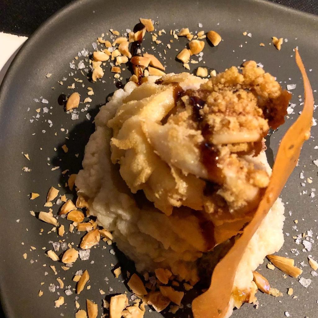Continuamos con calamar de playa valenciano a la romana con crema de coliflor y nuez moscada, acompañado por una chip de pa padam hindú y teriyaki de mistela. La galletita me recordó a las rosquilletas de anisetes de los hornos de toda la vida y la coliflor, preparada con comino también, me recordó a la que suelo prepararme en casa cunado no está mi madre.