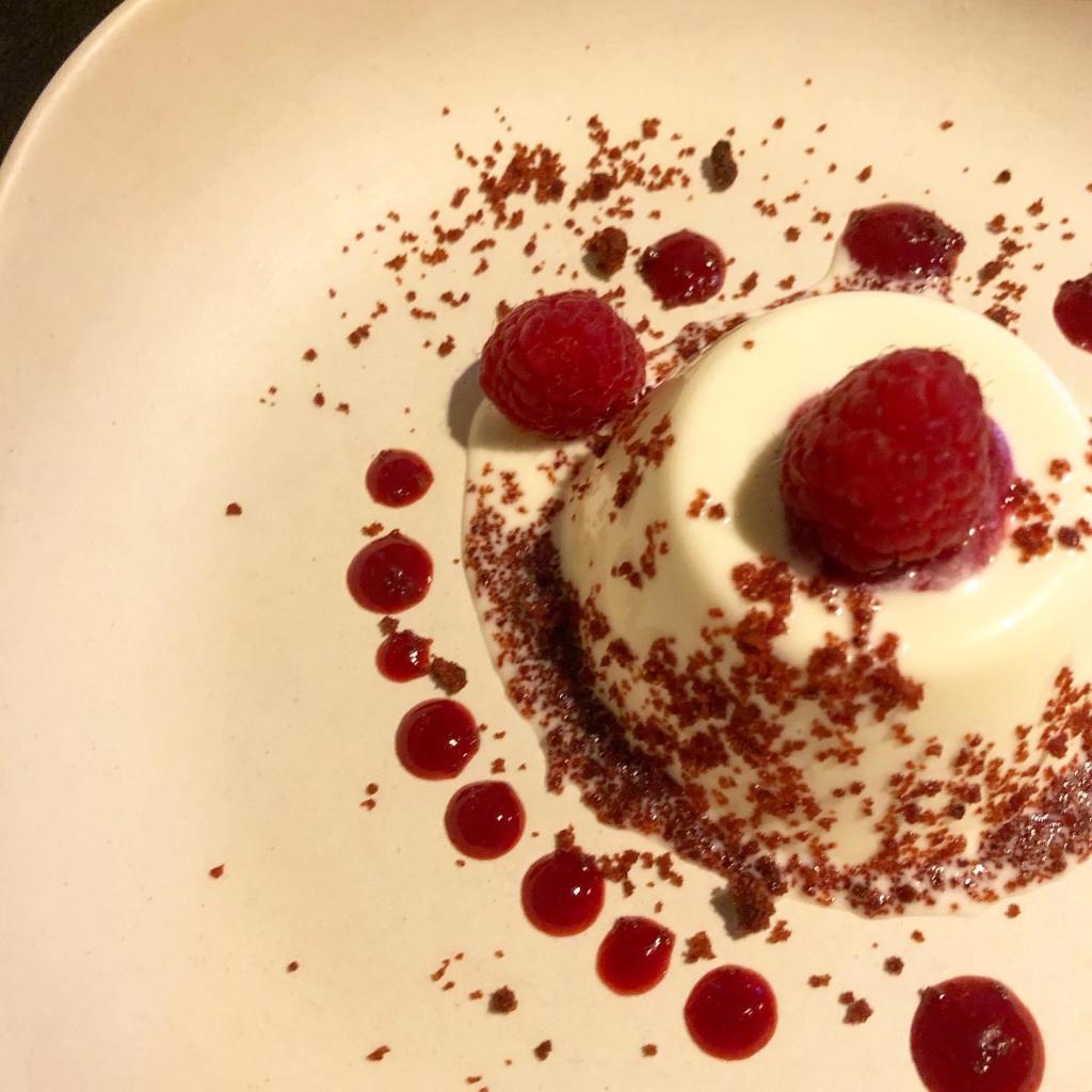 De postre, panacotta con frutos rojos ácidos y migajas de bizcocho de remolacha. Un final suave, ligero… estupendo para cerrar el ciclo de una tanda de recetas mágicas y majestuosas. Todo acompañado de fantástico @vinoloess (Verdejo), recomendado por el chef.