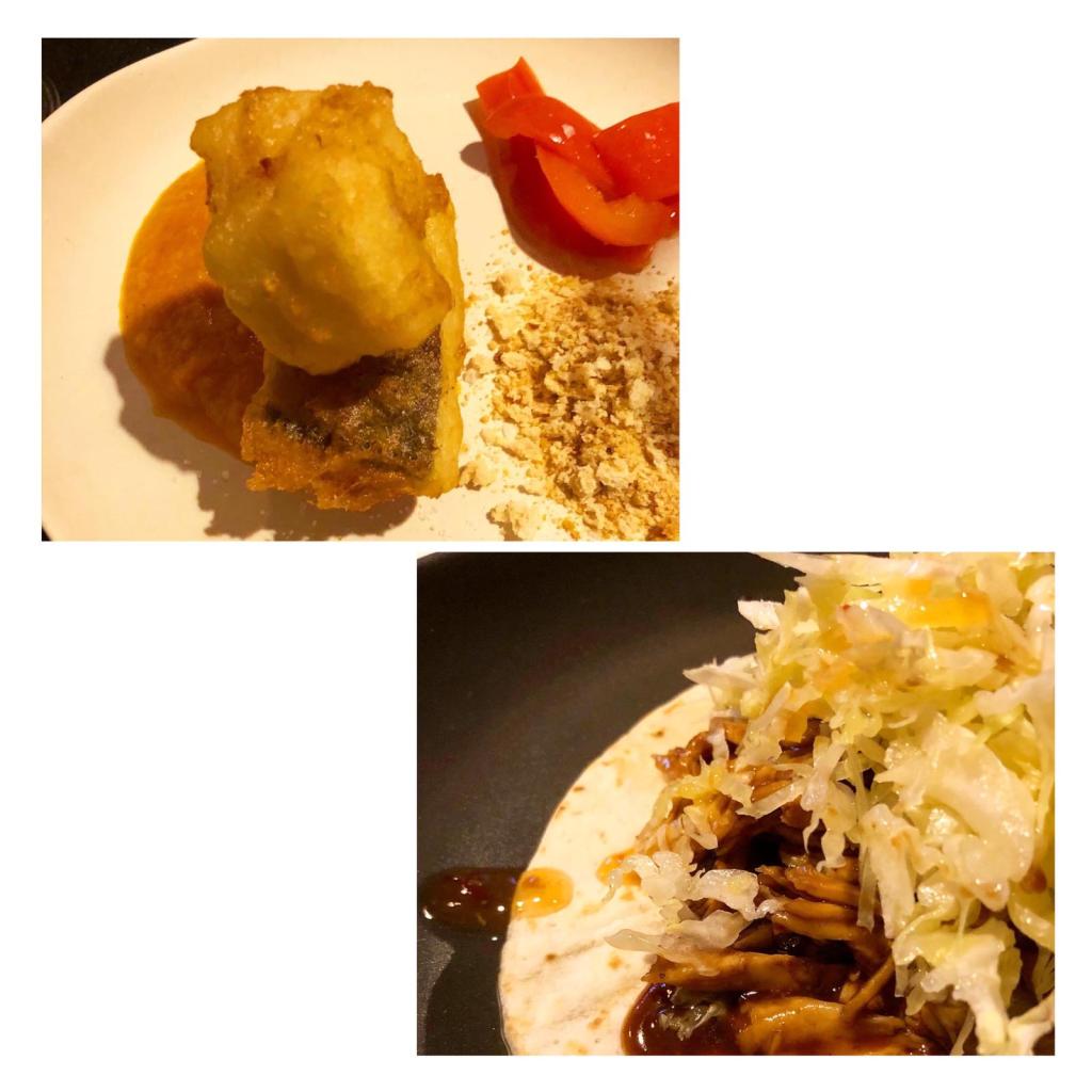 Como éramos dos y yo no como carne, para mí, bacalao en tempura con versión de esgarraet, mientras que, para mi acompañante, taco de pollo al chocolate con col rizada. Por lo visto aquel toque de chocolate fue magistral, pues expresión de gozo al probarlo fue divina.